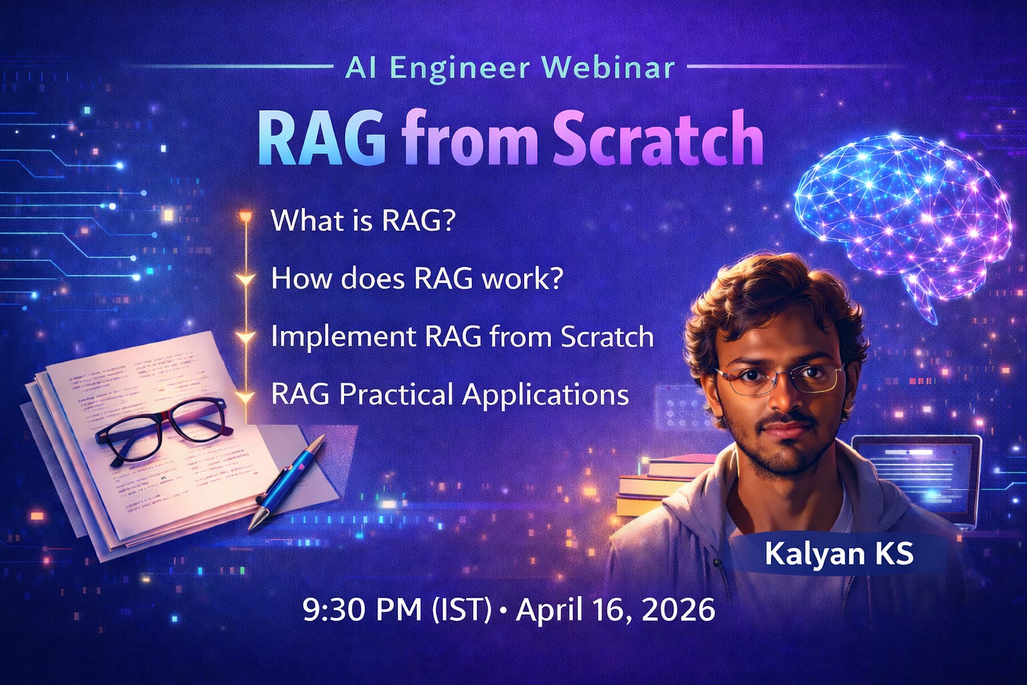 In this webinar, you will understand and implement RAG from scratch without using any frameworks like LangChain or Llama Index.