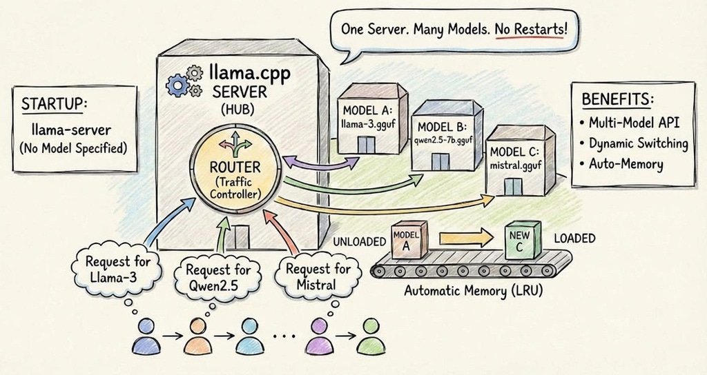 Router mode is a new way to run the llama cpp server that lets you manage multiple AI models at the same time without restarting the server each time you switch or load a model.